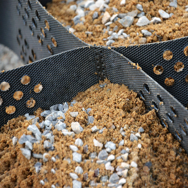 Чтобы облегчить процесс дренажа грунтовых и атмосферных вод, стенки рёбер ячеек георешётки могут выпускаться с перфорацией. Для таких перфорированных изделий подойдёт использование крупнозернистых заполнителей, к примеру, щебня.